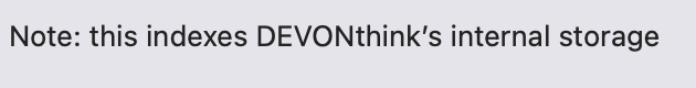 In the latest version, I noticed an option for indexing "DevonThink 3 storage data" which I assumed would index any DT3 package files it found. However, when I rebuilt the index with this selected, no such files were indexed. The note says "this indexes DevonThinks's internal storage" but no clue what this is. The tooltip refers to the DT3 application support folder which would be pretty useless. So how is this supposed to work? It would be great if I didn't have to individually specify each files.noindex file.
