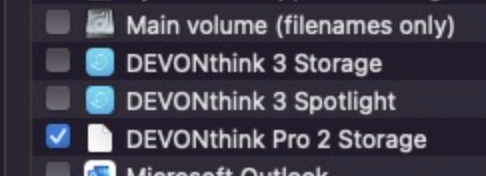 U have learned that a colleague has successfully indexed his DT3 files and outside of the application support folder but for some reason he has an option to check "Devonthink Pro 2 storage" which I don't have.