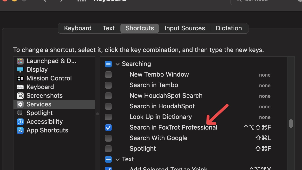 When I go to Keyboard Services I see FoxTrot in a "Search" section and not in the Files and Folders section when where the other search tools appear.