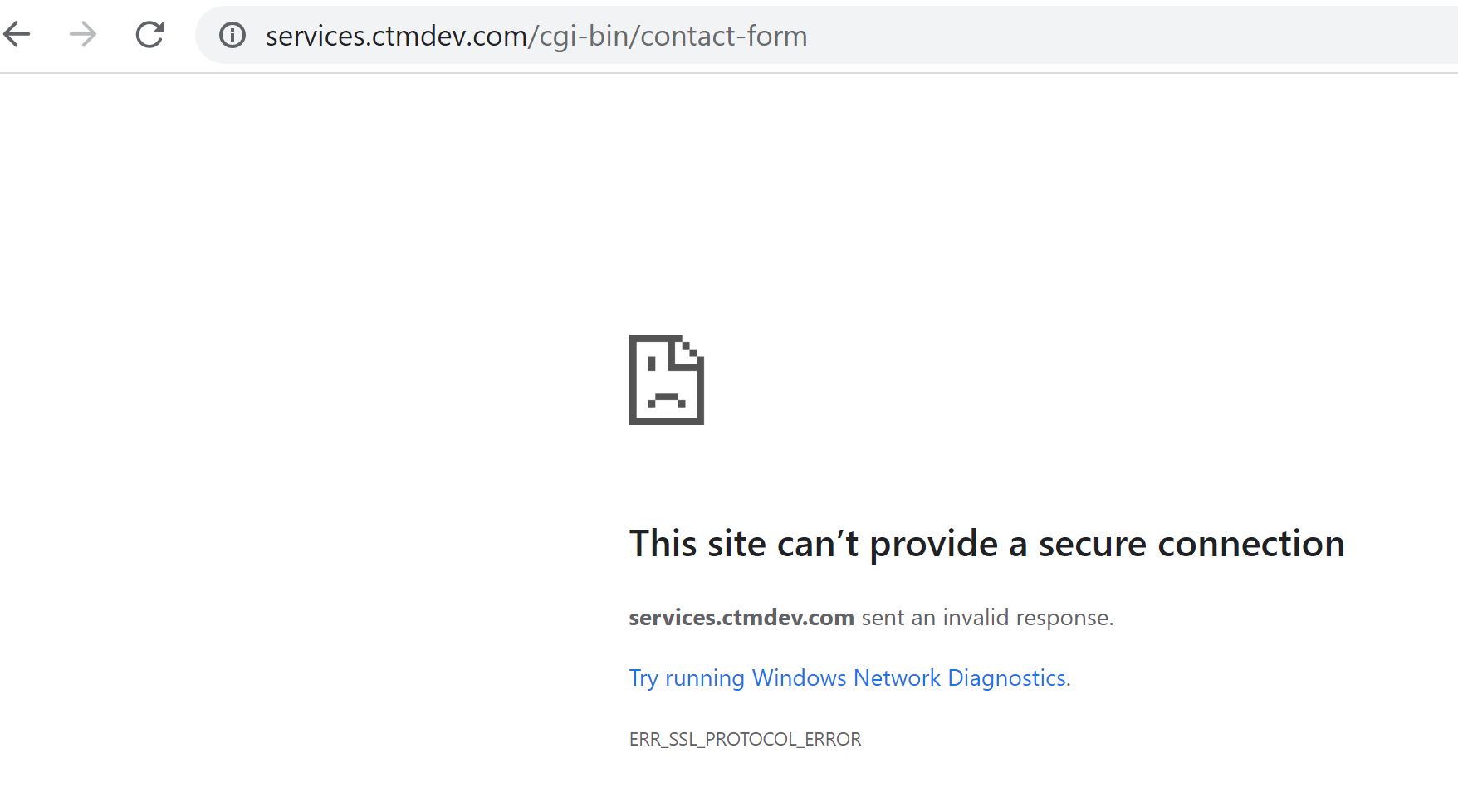 I think I may have figured this out. Malwarebytes is blocking the connection to ctmservices.gotdns.ch. It is classifying that as a phishing site. That is breaking the connection when I submit the form. It is probably nothing wrong with your server. Maybe you should check why that server is categorized as a phishing site.