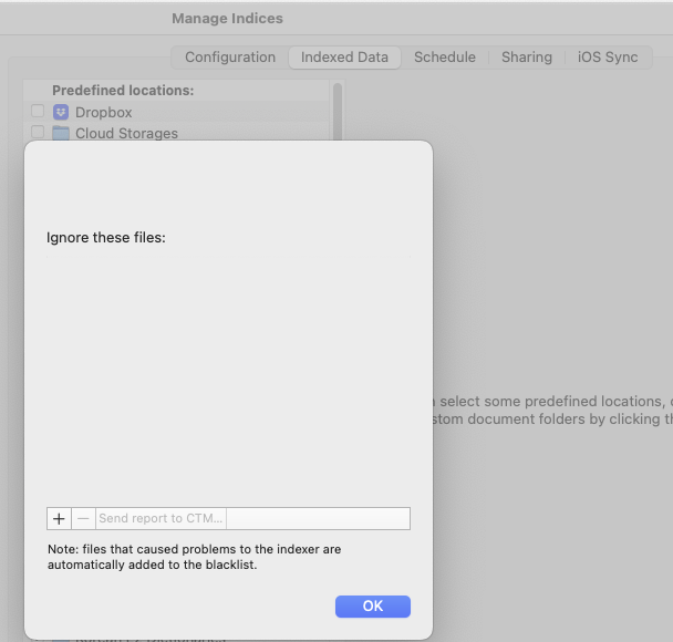 This occurred with the last 8.0 beta, too, but it also happens in the non-beta 8.0 version that I installed today. When I select from the menu "Indexes > Manage Indices," and then select my largest index (275,015 files, 25 GB index size), and then select its "Indexed Data" tab and then click the "Blacklist" button, I get a very long and blank window (with no alternating shaded/non-shaded rows) that never seems to populate with anything (no matter how long I leave it up), and runs off screen not showing the controls or button that should be visible. Hitting the "enter" key will make it disappear. I do not get the message that says something like "Items were recently added to the blacklist" when selecting this or the following described indexes. This does not happen to all indices. For another index, which is much smaller (1,339 files, 2.9 GB index size), I get the same blank window (no shaded/non-shaded rows) but it does not run off the screen. Another index (129,848 files, 6.8 GB index size) has the latter result, too. Other indexes which fall between these in number of files and size of index do not have this problem; they show the alternating shaded/non-shaded rows, and where appropriate, they show the ghosted gray names of previously blacklisted files that have since been resolved. The three problem indexes do share some files in common, but I don't know how to easily determine which. I have tried rebuilding the very large index but it did not help.