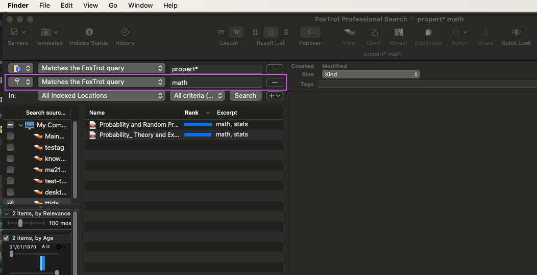 At the moment I'm thinking whether it'd be possible for me to tag the books in the second location with the tag "Linear Algebra", and then tell Foxtrot to only index these tagged files in this particular location while ignoring other files. I'm currently on Mac OS so I'm guessing tagging should be done with Mac OS's native file tags. I think what Mac OS does when tagging a file is to add an extended attribute to it; and I'm hoping that Foxtrot allows filtering such attributes when specifying which files to include in an index.