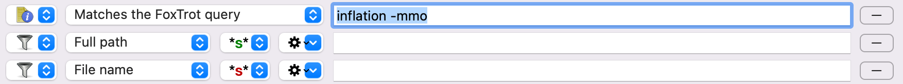 The realistic workflow where I experience this problem is this: Find all documents with the word "inflation" anywhere, and not the word "mmo" in its file name. Foxtrot query doesn't allow me to search by properties like file name, so I have to break my Foxtrot query into multiple fields. Please let me know if this is a bug, or if this is a limitation with Foxtrot Query exclusion syntax that's not described in documentation.